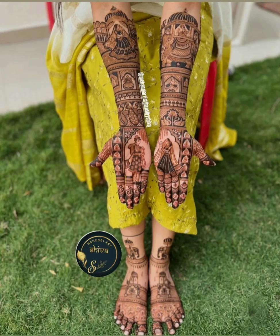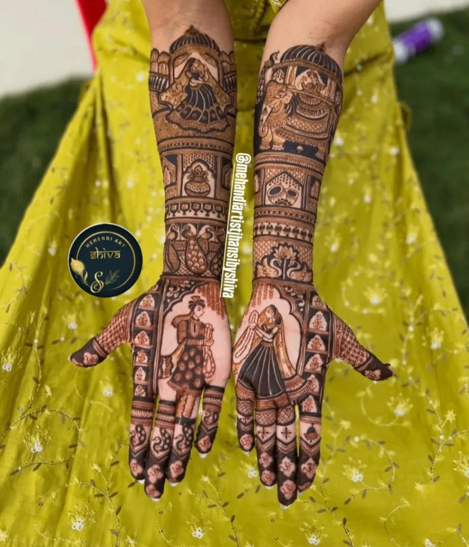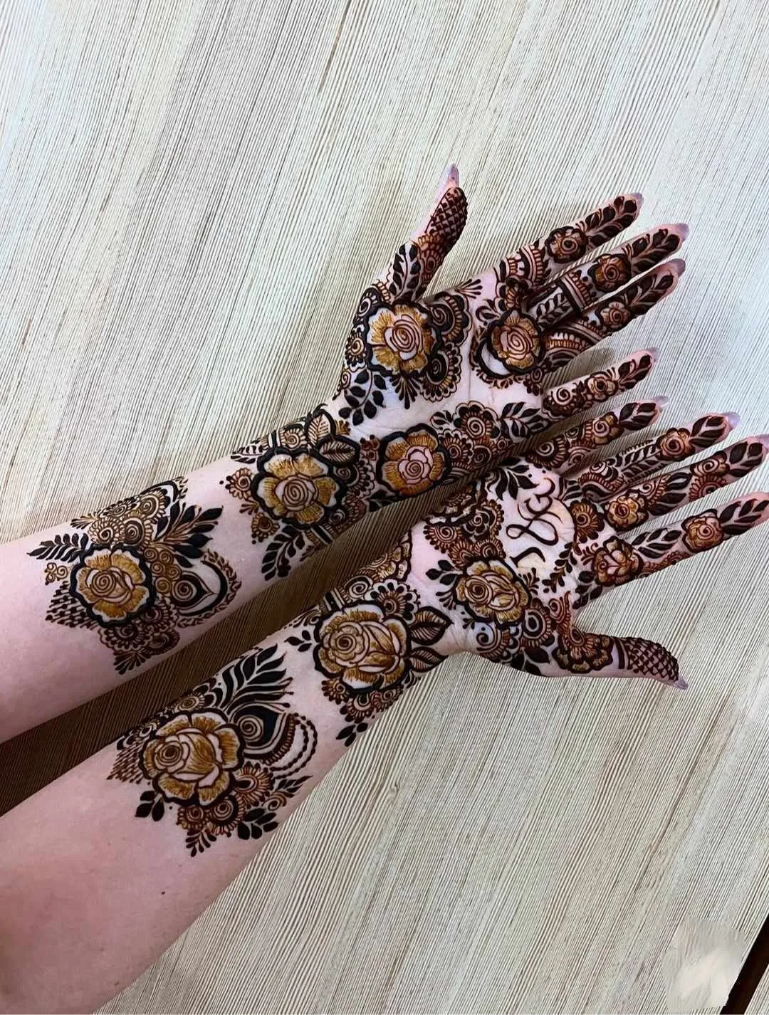 Full-hand bridal mehndi with detailed motifs, customisation and post-care guidance.