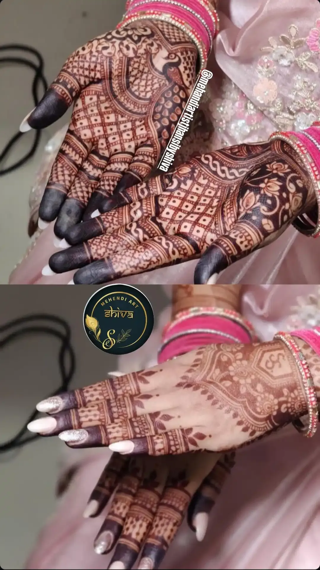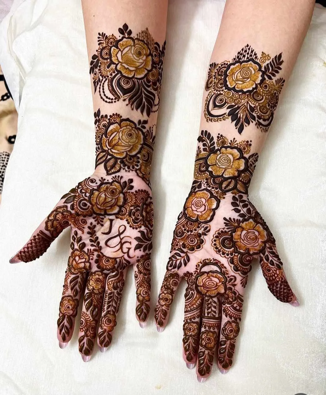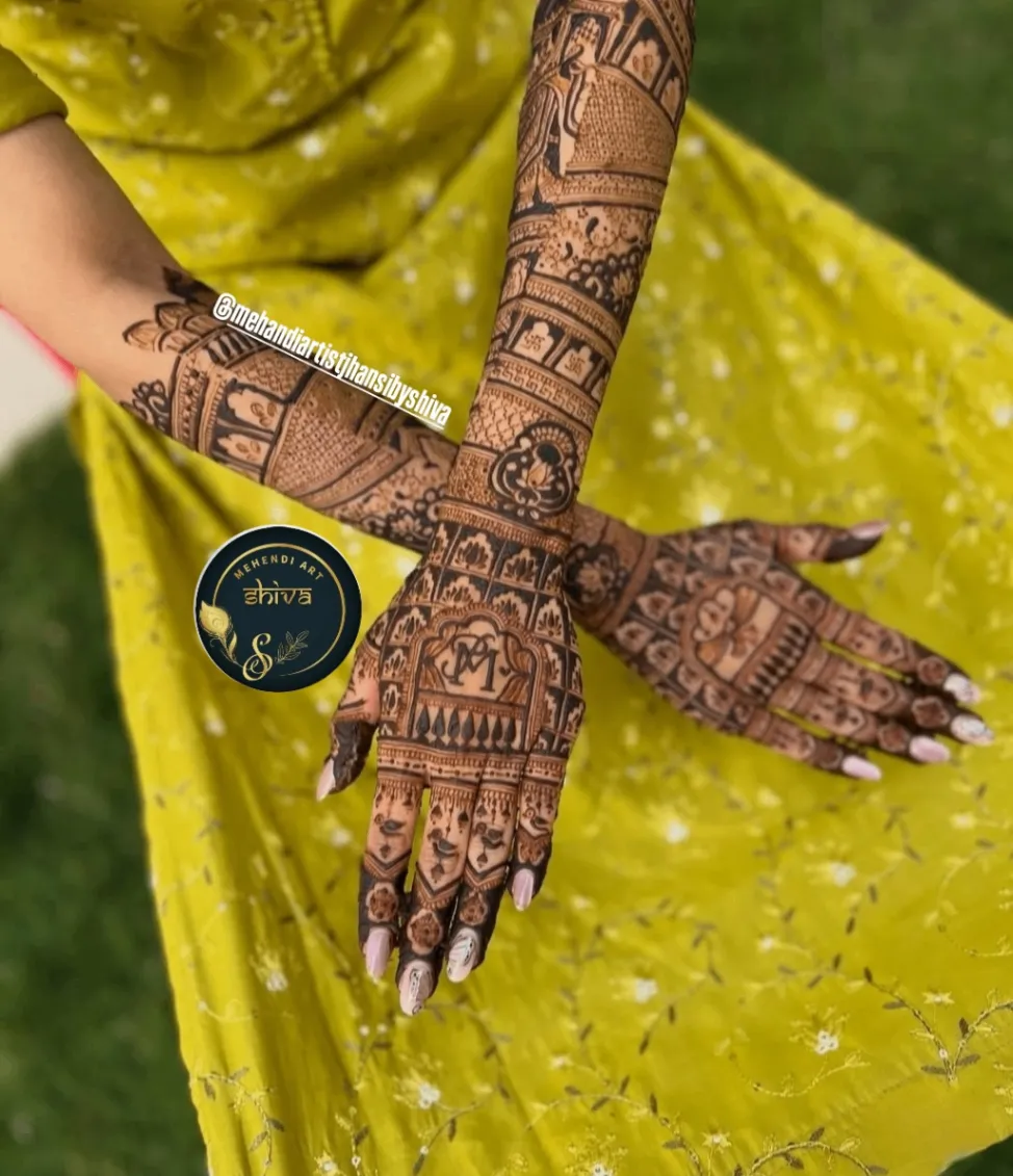 Full-hand bridal mehndi with detailed motifs, customisation and post-care guidance.